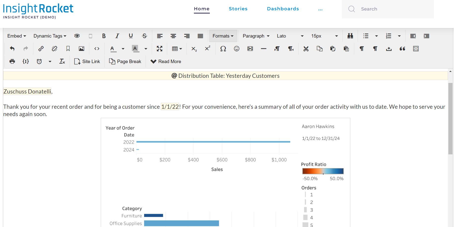 Tableau Stories are simply a way of sequencing the vizzes from a single workbook into a slideshow and adding captions for them. Insight Rocket stories can be in any style and format, much like those in newspapers or magazines. They also can weave together Tableau content from any workbooks with non-Tableau content to tell the full story. Insight Rocket stories can be handwritten, fully automated, or anything in between!